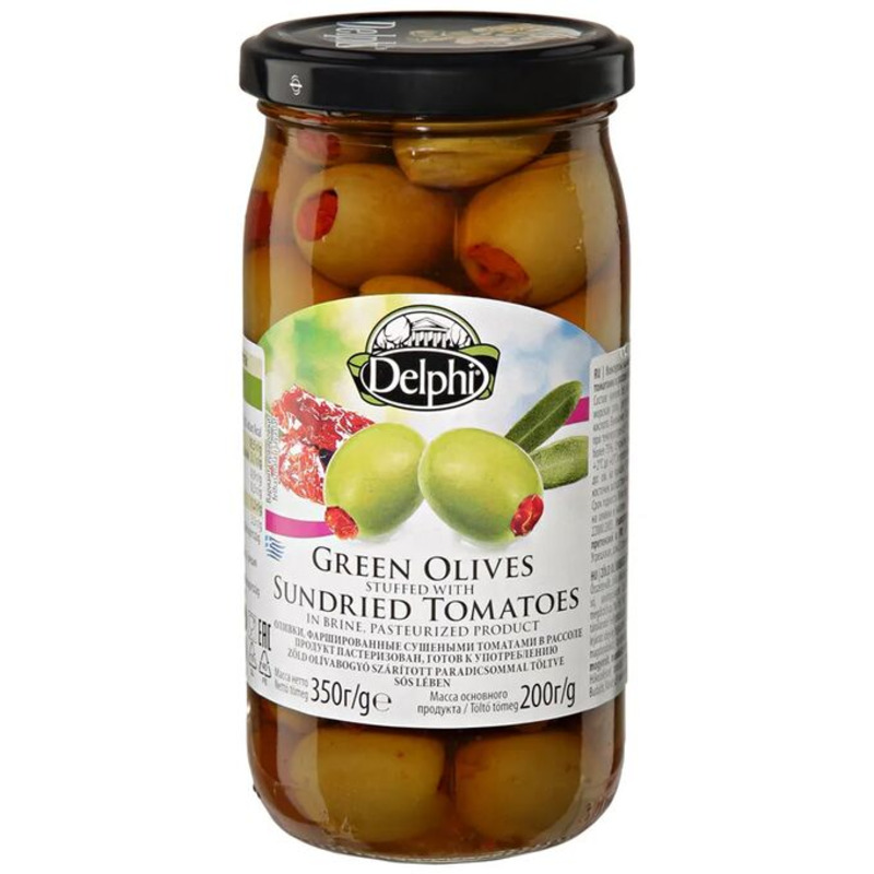 Оливки, каперсы, томаты "Delphi" Green Olives Stuffed with Sundried Tomatoes, 350 г