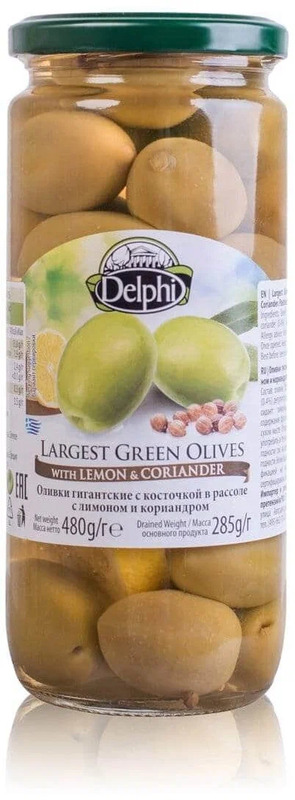 Отзывы Оливки, каперсы, томаты "Delphi" Largest Green Olives with Lemon & Coriander, 480 г