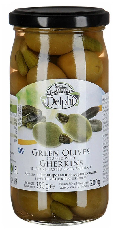 Отзывы Оливки, каперсы, томаты "Delphi" Olives in Brine Stuffed with Gherkins, 350 г